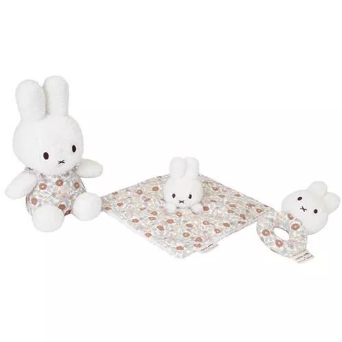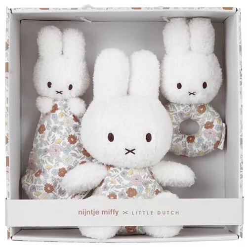Een mooie geschenkdoos met drie verschillende Nijntje-speeltjes ‘Nijntje Vintage Little Flowers giftset’ van het Nederlandse merk Little Dutch, in samenwerking met Nijntje-Miffy. De geschenkdoos met babyspeelgoed bestaat uit drie zachte speeltjes om mee te knuffelen, te kroelen en te spelen: