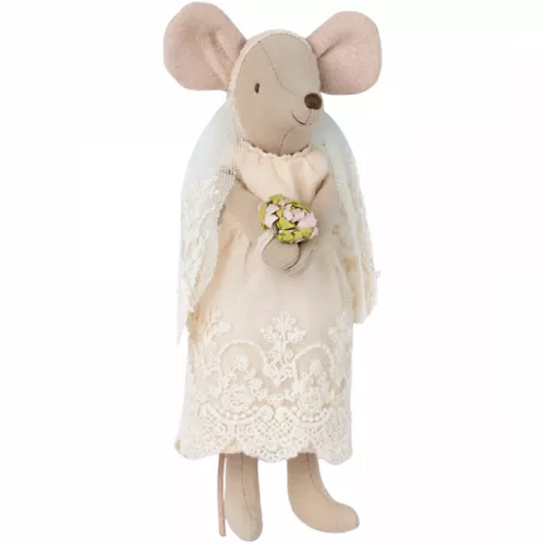 Het muizenstel is klaar om te trouwen en hebben zich uitgedost. Meneer muis draagt een zwart colbertje, een zwarte broek en een vrolijke strik. Mevrouw muis draagt een witte trouwjurk, sluier en een boeket.