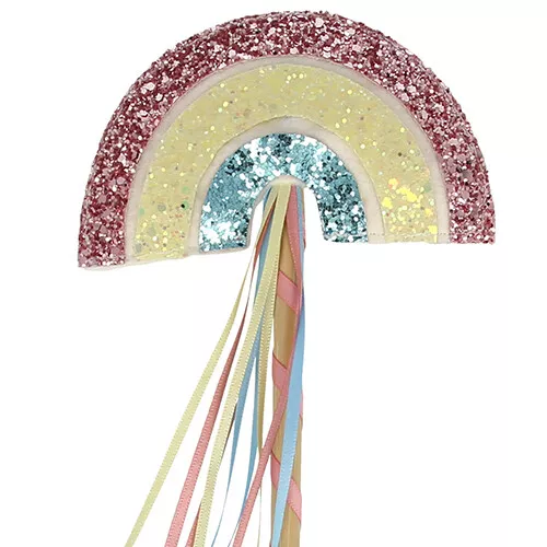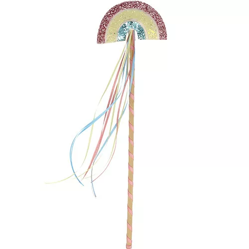 De bovenkant van de jurk sluit met een drukknoopsluiting. De toverstaf is gemaakt met een glitterstof en het handvat is versierd met kleurrijke linten die dansen door de lucht.