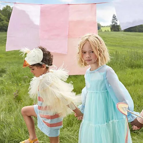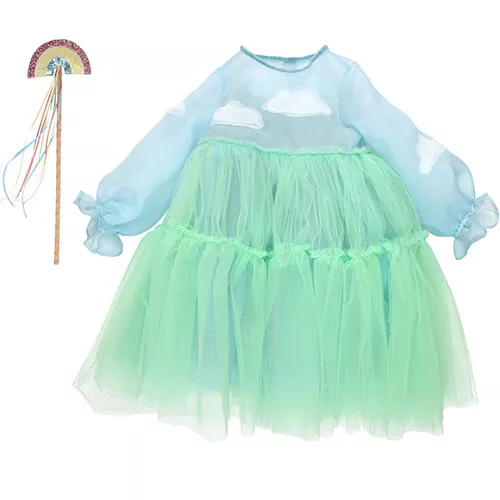 Een meisje verandert moeiteloos in een wolkenprinses met de verkleedkleding ‘Cloud Dress Costume 3-4 yrs’ van het Engelse merk Meri Meri. De tule kinderjurk in pasteltinten danst in de lucht bij het draaien van een rondje. Met regenboogstaf voor een extra betoverende outfit.
