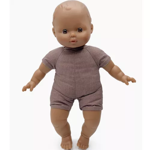 De babypop heeft bruine oogjes. Het gladde hoofdje, armen en benen zijn van vinyl met de geur van een vleugje vanille.