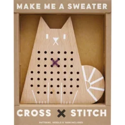 Geef de kat een geborduurd truitje met het setje ‘Cross Stitch Friends – Cat’ van het Amerikaanse merk Moon Picnic. Het houten poesje heeft gaten in zijn buik waar met wol doorheen geregen kan worden. Rijg de garen door de gaten heen en creëer verschillende patronen.