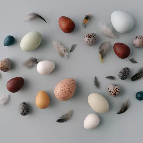 De eieren hebben verschillende groottes en kleuren, ideaal voor een fantasierijk spel of als decoratie op een seizoenstafel.