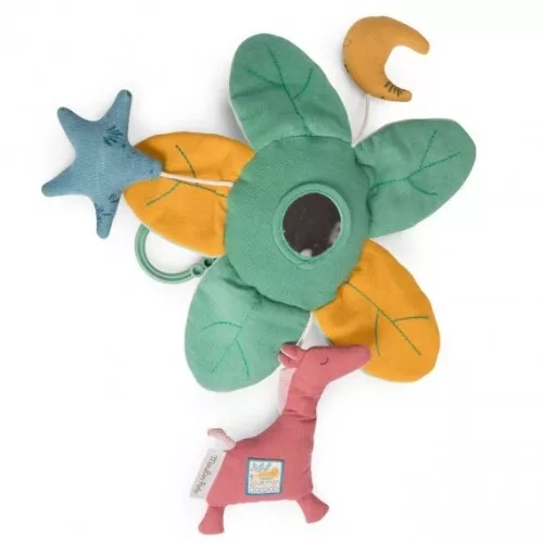 De activiteitenknuffel bestaat uit stoffen bladeren gevuld met knisperpapier, een knuffelsterretje dat piept als erin geknepen wordt en twee rammelaars in de vorm van een maan en een giraffe. In het midden van het activiteitenspeeltje bevindt zich een kindveilig spiegeltje, zodat de kleine kennis kan maken met het eigen spiegelbeeld.