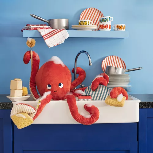 Met de lange tentakels, de geribbelde onderzijde en de verschillende stoffen en texturen valt er van alles te voelen en te ontdekken met deze vrolijke, rode octopusknuffel.
