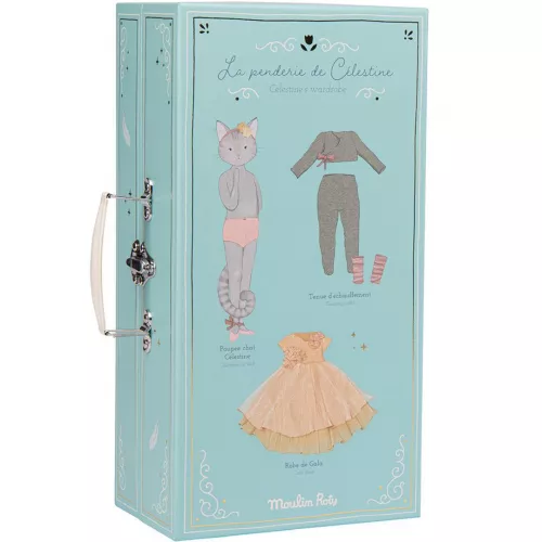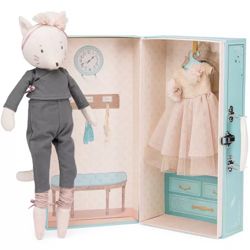 Met deze poppenkoffer ‘Valise la Penderie de Célestine’ laat de knuffelpoes uit de collectie ‘La petite école de danse’ van het Franse merk Moulin Roty haar kledingkast zien.
