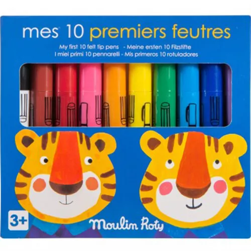 Perfect om alle creatieve fantasieën op papier te zetten. Deze viltstiftenset ‘Mes 10 premiers feutres’ van het Franse merk Moulin Roty bevat 10 viltstiften speciaal ontworpen voor jonge kinderen.