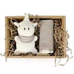 Een mooie cadeauset ‘My Little Unicorn – Harbor’ van het Portugese merk Mrs Ertha, met een mousseline hydrofieldoek en een onweerstaanbare knuffelrammelaar.