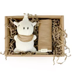Een mooie cadeauset ‘My Little Unicorn – Peanut’ van het Portugese merk Mrs Ertha, met een mousseline hydrofieldoek en een onweerstaanbare knuffelrammelaar.