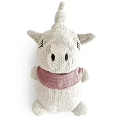 Deze handgemaakte, gebreide eenhoorn ‘Clay Pink’ van het Portugese merk Mrs Ertha is een knuffel en speelgoed rammelaar in één.