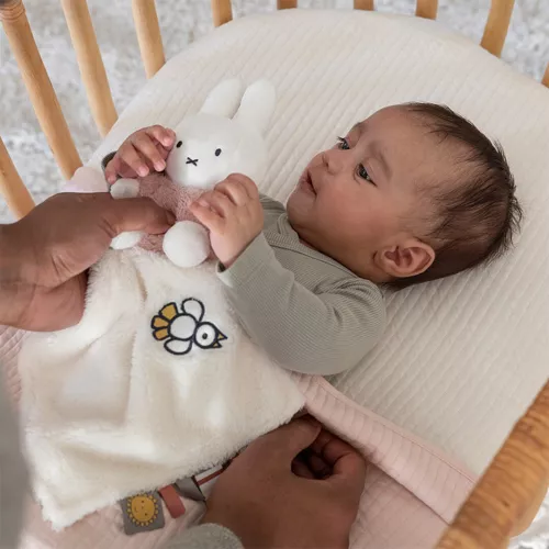 Het knuffeldoekje heeft meerdere labels die spelenderwijs ontdekt kunnen worden. Het geborduurde vogeltje maakt de knuffeldoek een extra vrolijke metgezel in de box, onderweg of tijdens het slapen.