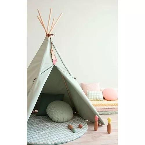 Een groene tipi speeltent ‘Nevada Tepee Provence Green’ uit de Pure Line serie van het Spaanse merk Nobodinoz versierd met twee houten veren in de nok.