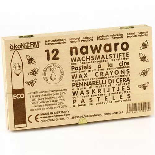 Een set 12 waskrijtjes ‘Wax Crayons Nawaro, 12 colors’ van het Duitse merk ökoNorm in een houten doosje. De lange waskrijtjes dekken goed en gaan lang mee. De ergonomische vorm van de krijtjes maakt het mogelijk om met dikke lijnen te tekenen en grote tekeningen in te kleuren.