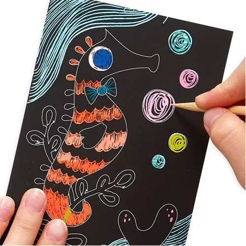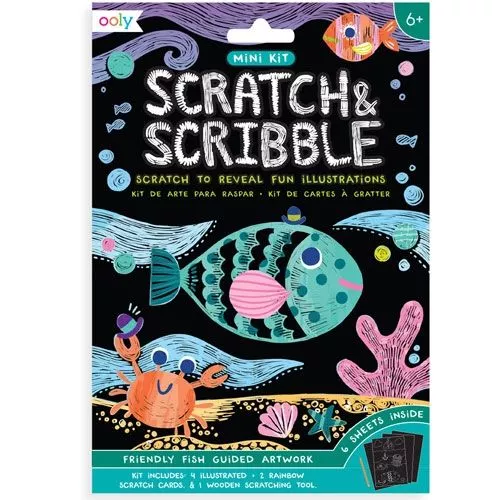 Krassen op de illustraties en een wonderlijke onderwaterwereld komt te voorschijn. Gegarandeerd veel plezier met deze ‘Mini Scratch & Scribble Art Kit – Friendly Fish‘ van het Amerikaanse merk Ooly.