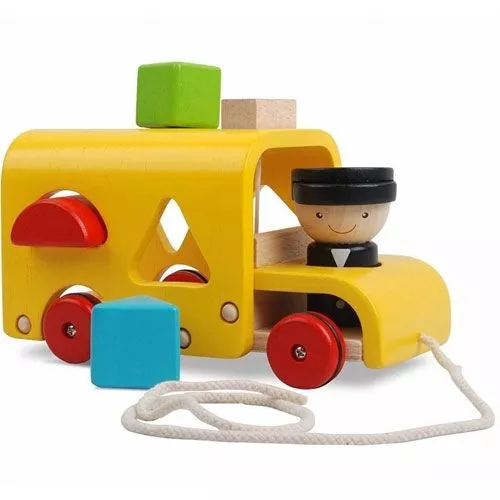 Het vrolijke busje met de vriendelijke buschaffeur daagt uit om de drie gekleurde blokken in de juiste vormen te steken. Zitten ze allemaal veilig in de bus? Trek dan het houten rondje omhoog en alle blokken rollen er aan de achterkant weer uit.