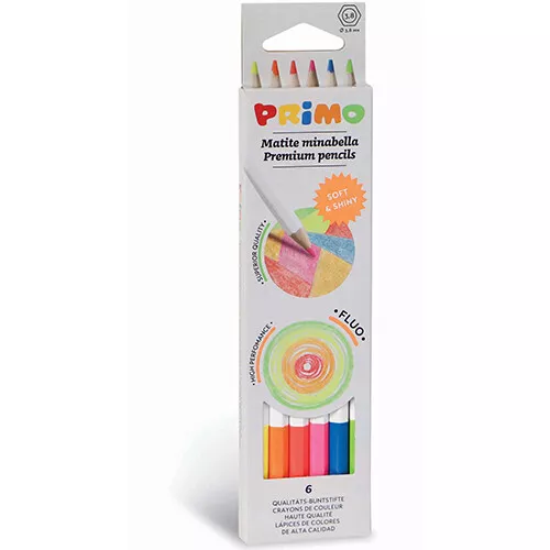 Voor een lekker fel accent, een set van zes kleurpotloden ‘6 Minabella Fluo’ van het Italiaanse merk Primo in fluoriserende kleuren. Geschikt voor elk type papier.