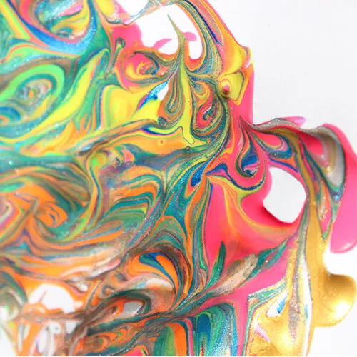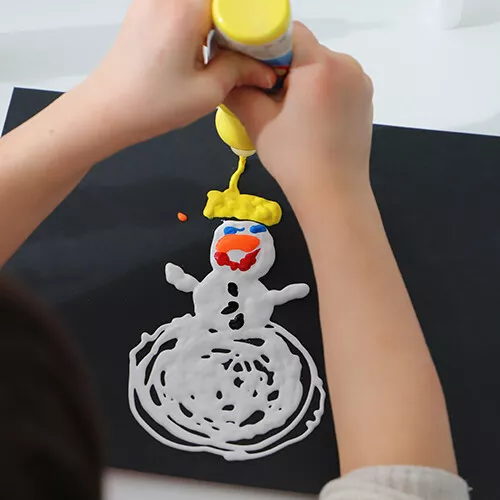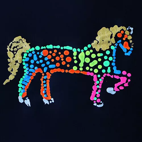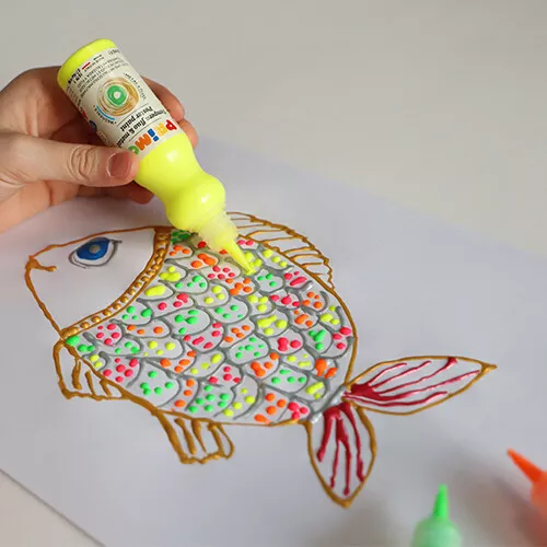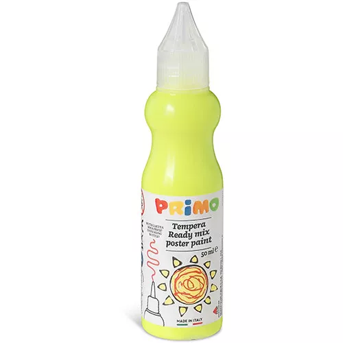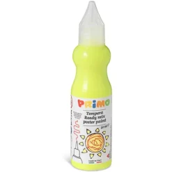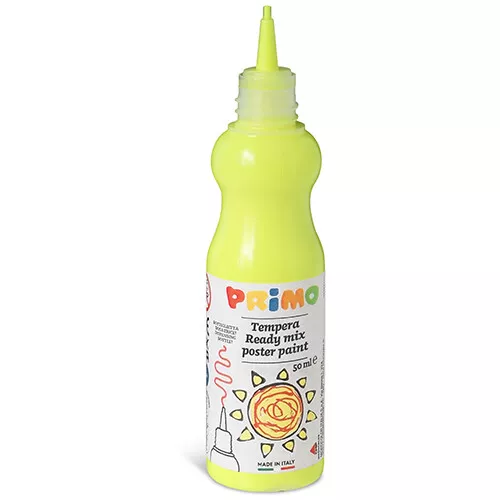 Fluorescerende gele plakkaatverf in een handig spuitflesje van het Italiaanse merk Primo. Met het spuitflesje kan de verf gedoseerd en precies aangebracht worden.