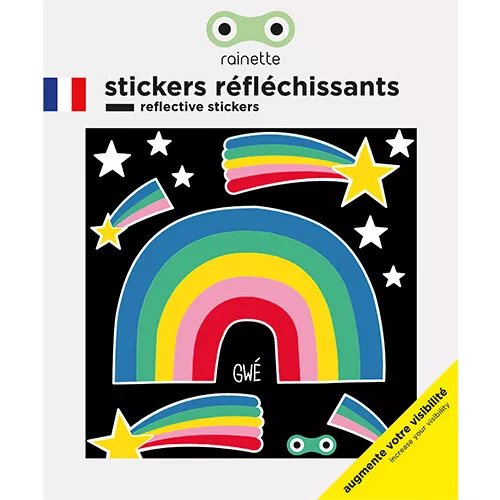 Pimp de kinderfiets of kinderhelm met deze reflecterende stickerset ‘Arc-en-ciel’ van het Franse merk Rainette. De stickerset is perfect voor het vergroten van de zichtbaarheid in het donker en voor kinderen om een eigen draai aan hun helm of favoriete vervoersmiddel te geven!