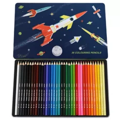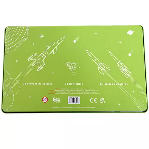 Voor een jonge kunstenaar, de start van het nieuwe schooljaar of thuis, een uitgebreide doos met 36 kleurpotloden ‘Space Age’ van het Engelse merk Rex London. Met alle kleuren van de regenboog kunnen kinderen aan de slag tekeningen en kleurplaten.