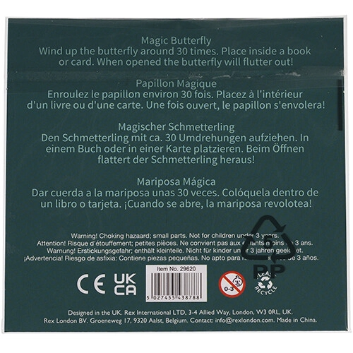 De magische vlinder kan opgewonden worden door de vleugels rond te draaien. Plaats de verrassingsvlinder vervolgens tussen een brief, verjaardagskaart of uitnodiging en de ontvanger wordt begroet door een fladderende vlinder!