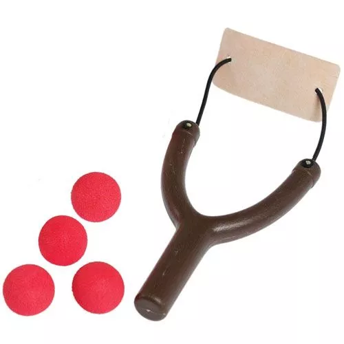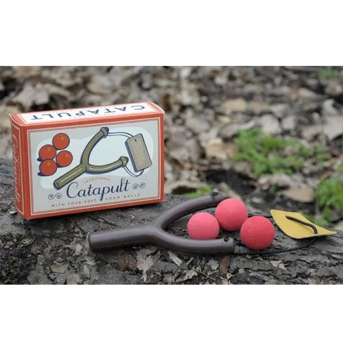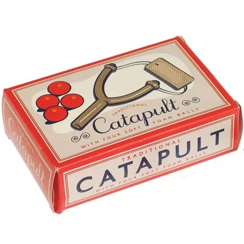 Een speelgoed katapult met vier zachte foamballetjes van het merk Rex London. De katapult is verpakt in een leuke retro geschenkverpakking.