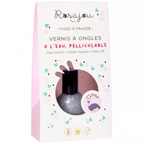 Een kleurtje met glitters op de nagels net als mama of tutten met vriendinnen? Dat kan veilig met de vegan kindernagellak op waterbasis ‘Star’ van het Franse merk Rosajou. De zilveren glitternagellak kan zo aangebracht worden of als laag over een andere kleur om de nagels een feestelijk tintje te geven.