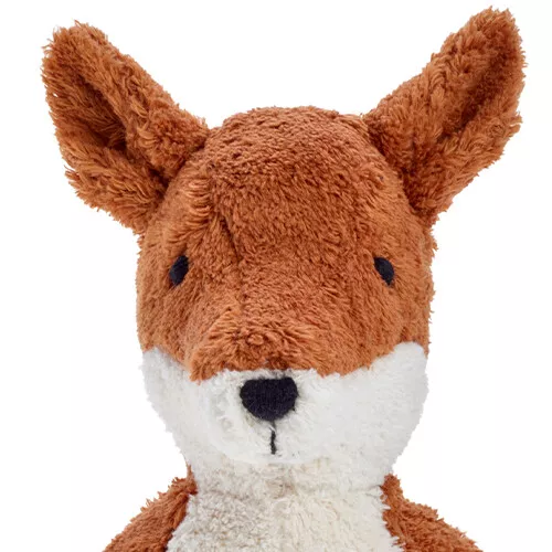 De handgemaakte vossenknuffel van katoenen pluche heeft een stevige kop met geborduurde oogjes. De vos is gevuld met lamswol.