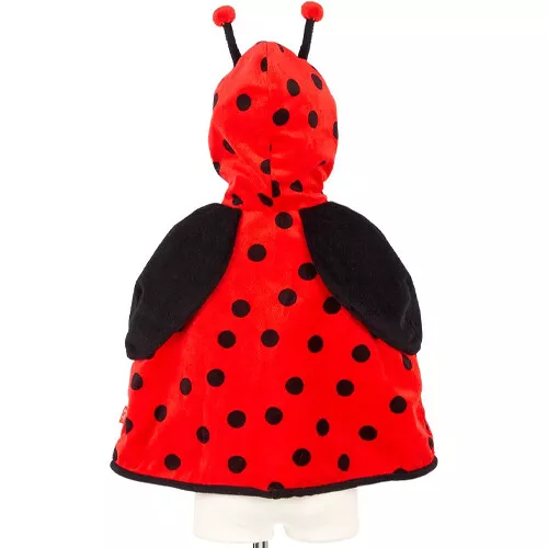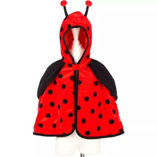 De rode verkleedcape met zwarte stippen is heerlijk aaibaar en voorzien van een capuchon met voelsprieten. Aan de voorkant sluit de cape met klittenband.