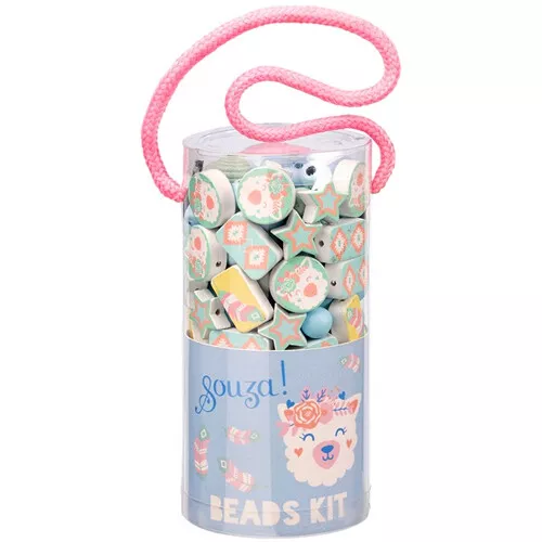 Deze knutselset ‘Kralen knutsel set lama pastel blauw-groen’ van het Nederlandse merk Souza for Kids bestaat uit stervormige, rechthoekige, platte en bolle ronde kralen in verschillende pasteltinten.