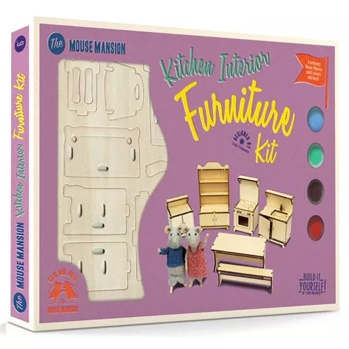 Dit houten bouwpakket ‘Mouse Mansion Furniture Kit – Kitchen’ van het Nederlandse merk Studio Schaapman is een DIY knutselpakket gebaseerd op de Muizenhuis kinderboeken van Karina Schaapman. Met deze bouwset kunnen kinderen hun eigen poppenmeubeltjes maken en hun muizen- of poppenhuis zelf inrichten en versieren.