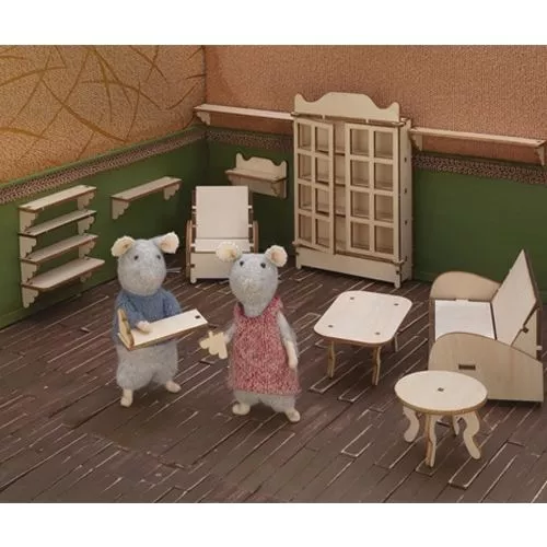 Dit houten bouwpakket ‘Mouse Mansion Furniture Kit – Living Room’ van het Nederlandse merk Studio Schaapman is een DIY knutselpakket gebaseerd op de Muizenhuis kinderboeken van Karina Schaapman. Met deze bouwset kunnen kinderen hun eigen poppenmeubeltjes maken en hun muizen- of poppenhuis zelf inrichten en versieren.