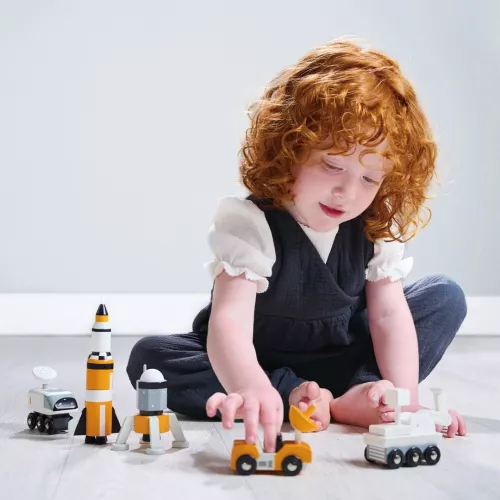 Deze vijf houten ruimtevoertuigen ‘Space Voyager Set’ van het Engelse merk Tender Leaf Toys zijn klaar om onbekende planeten te verkennen. Fascinerend speelgoed voor nieuwsgierige astronauten in spé, dat hun verbeelding stimuleert.