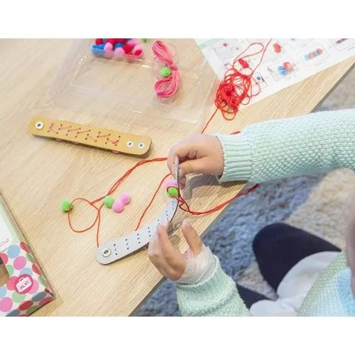 Versier deze armbandjes met fleurige, zachte mini pompons met deze creatieve kit ‘Jewellery Design Kit Pom Pom Bracelets’ van het Australische merk Tiger Tribe. Het is een handwerkje waarbij je de kleurige pompons door de gaatjes van het armbandje moet naaien.