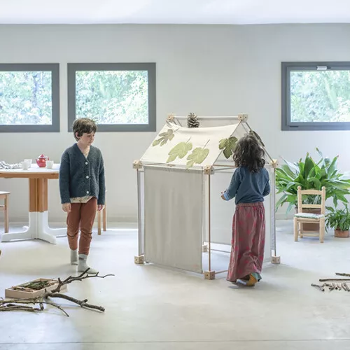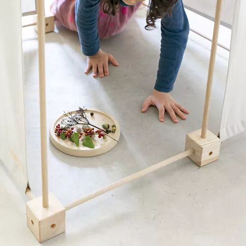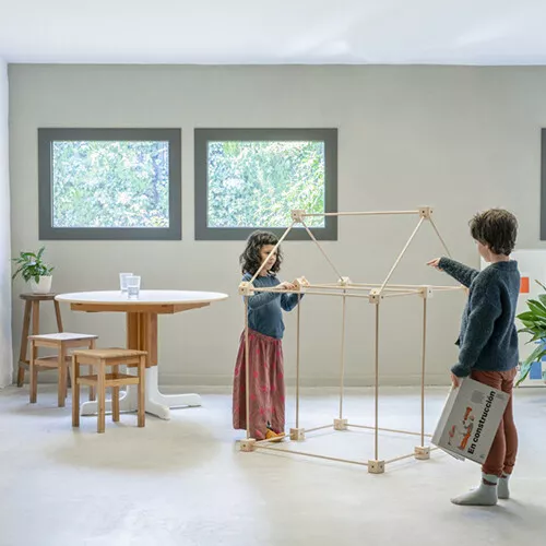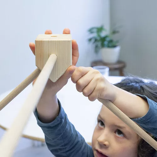 Kinderen bouwen prachtige bouwwerken met het educatieve constructiespeelgoed ‘Large Kernel – Kreema’ van het merk Trígonos met houten blokken, stokken en lappen stof. Wordt het een speelhuis, leeshoek, theater; jonge architecten krijgen vrij spel!