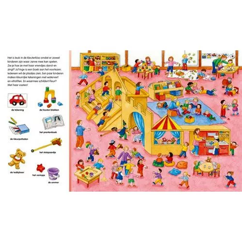 Een zoek- en kijk kinderboek om steeds weer in open te slaan. Een korte tekst is een steuntje om zelf een verhaaltje te maken bij de tekeningen.