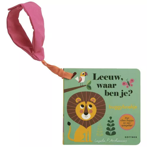 ‘Leeuw, waar ben je?’ is een klein kartonboekje door Ingela P. Arrhenius met een sterke lus voor aan de buggy. Onder de flapjes van dit kinderboek zitten allerlei dieren verborgen, zoals een olifant, een krokodil en natuurlijk een leeuw.