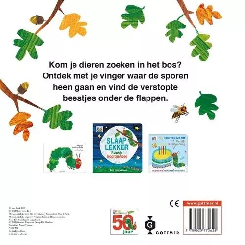 In het flapjesboek ‘Rupsje Nooitgenoeg: zoek en vind’ hebben Rupsje Nooitgenoeg en zijn vriendjes zich verstopt. Een zoekboekje voor kleine speurneuzen, in de kenmerkende tekenstijl van Eric Carle.