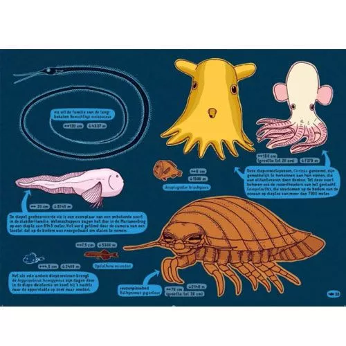 Twee boeken in één: de ene helft van het boek speelt zich af onder de grond, als je het boek omdraait ben je onder water. Kom alles te weten over grotten, mijnen, dieren die leven onder de grond, vulkanen, duikboten, loopgraven, tunnels, fossielen en zoveel meer.