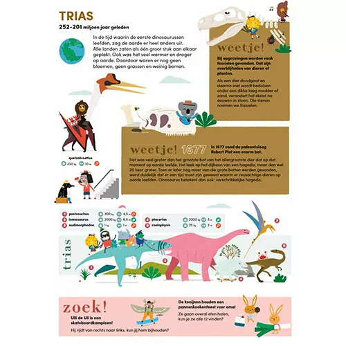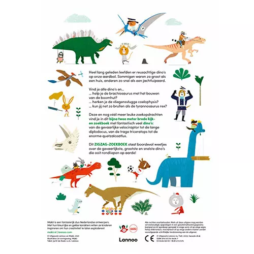 Het zoekboek ‘Zigzag – Dinosaurussen bijna 2 meter breed’ van Makii staat boordevol weetjes over dinosaurussen als de Celociraptor en de lange Doplodocus.