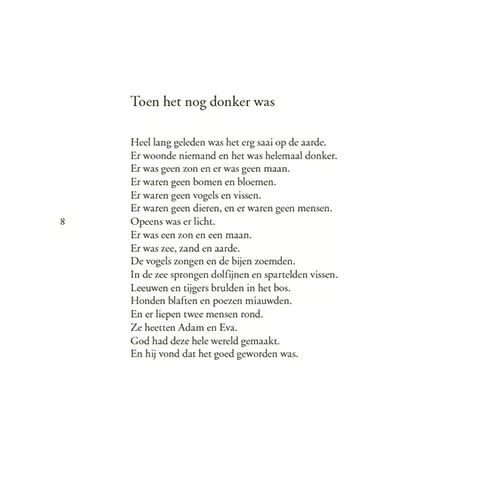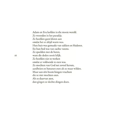 In eenvoudige, maar fantasierijke bewoordingen vertelt Herma Vogel over Adam en Eva in het paradijs en over David die een reus verslaat, over de geboorte van Jezus en over Pasen en Pinksteren. Prachtig geïllustreerd door Gitte Spee.