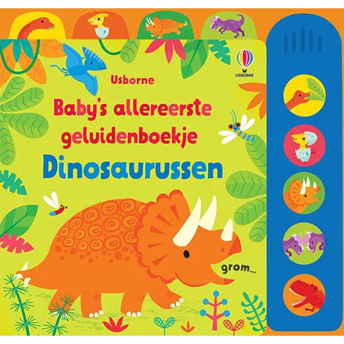 Op de kleurrijke bladzijdes van ‘Baby’s allereerste geluidenboekje – Dinosaurussen’ ontdekken baby’s een hongerige diplodocus, piepende babydino’s en een brullende T-rex. Als ze op de knopjes in het babyboekje drukken, horen ze de geluiden van de dino’s – en kunnen ze die nadoen!
