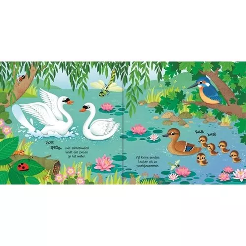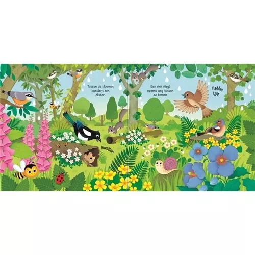 Op iedere pagina zijn gaten en stukken reliëf te vinden om de zintuigen te stimuleren. Druk op knoppen van het peuterboek en ontdek welke vogelgeluiden er te horen zijn.