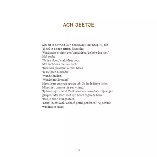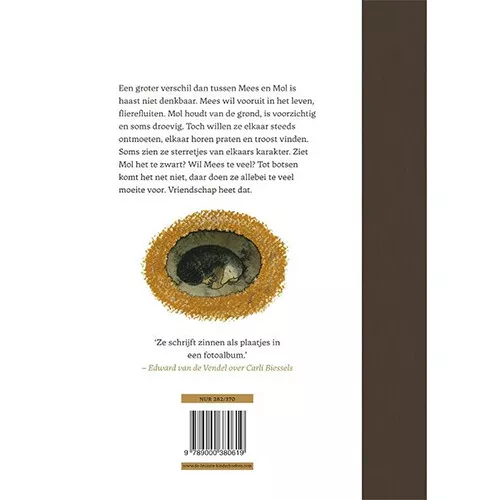 Een groter verschil dan tussen Mees en Mol is haast niet denkbaar. Mees wil vooruit in het leven, flierefluiten. Mol houdt van de grond, is voorzichtig en soms droevig. Toch willen ze elkaar steeds ontmoeten, elkaar horen praten en troost vinden bij elkaar. Soms zien ze sterretjes van elkaars karakter. Ziet Mol het te zwart? Wil Mees te veel? Tot botsen komt het net niet, daar doen ze allebei te veel moeite voor. Vriendschap heet dat.