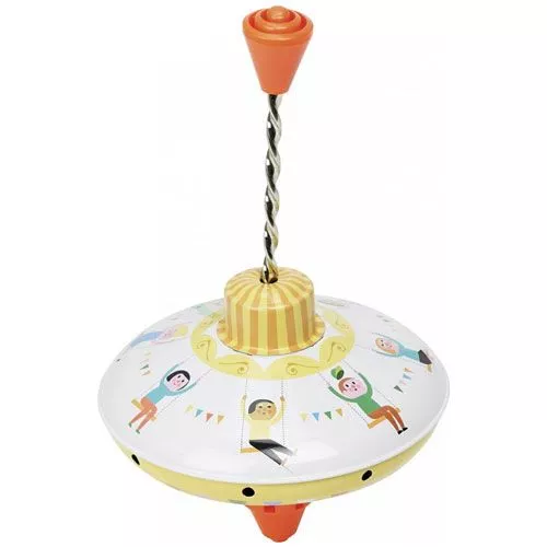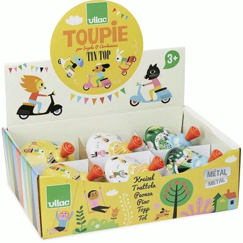 Een kleine metalen, retro draaitol van het Franse merk Vilac met prachtige illustraties van Ingela P. Arrhenius. Deze speelgoedtol werkt eenvoudig door het kunststoffen, oranje handvatje snel omhoog en omlaag te duwen. Doe dit een paar keer om snelheid te creëren en zie hem dan in het rond draaien op zijn as.