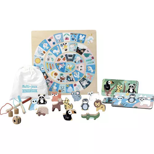 Een spelletjesdoos ‘Multi-Jeux des tout petits’ van het Franse merk Vilac met 5 klassieke spellen met vriendelijke, houten dierfiguuurtjes uit de ijszee, het bos, de savanne en de jungle. Deze gezellige spellenset met illustraties van Michelle Carlslund bevat 2 magnetische hengels om jungledieren mee te vissen, een dubbelzijdig speelbord met ganzenbord en het ladderspel, vier lottokaarten voor bingo en een stoffen tas voor een voel- en raadspel!