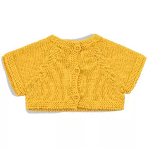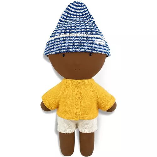 De babypop gaat graag mee op stap in dit behaaglijke, gebreide poppenvest. De katoenen poppenkledingset ‘Look #81’ van het Spaanse merk We Are Gommu bestaat uit een geel poppenvest met knoopjes en een blauw-wit gestreepte poppenmuts.