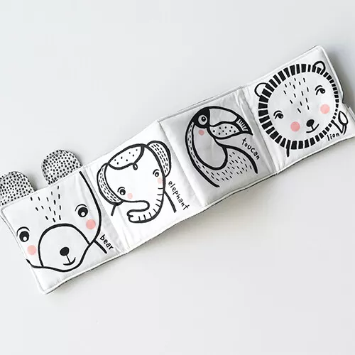 In dit stoffen babyboekje ‘Friendly Faces in the Wild’ van het Amerikaanse merk Wee Gallery ontmoeten baby’s Bear en zijn drie dierenvrienden: Elephant, Toucan en Lion. Een klein verhaal in grote zwart-witte lijnen en gekleurde accenten: aangenaam kennis te maken!